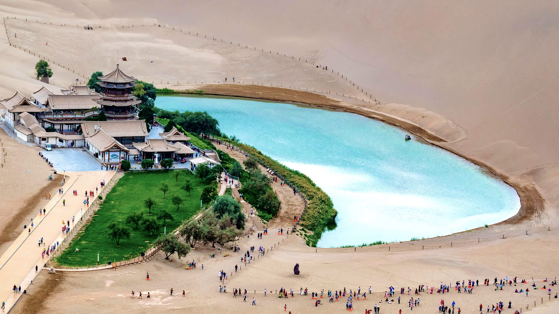* Minh Sa Sơn - Nguyệt Nha Tuyền - hồ nước giữa lòng sa mạc: là hồ nước ngọt có hình trăng lưỡi liềm nằm trong ốc đảo của sa mạc Gobi, cách 5 km về phía nam của thành phố Đôn Hoàng, tỉnh Cam Túc, Trung Quốc. Hồ có chiều dài khoảng 218 m, rộng 54 m. Nguyệt Nha Tuyền còn là một trong những điểm dừng chân của các thương nhân trên “con đường tơ lụa”. Một ngôi chùa đã được xây dựng bên cạnh hồ khiến cho cảnh quan thiên nhiên nơi đây trở nên độc đáo.